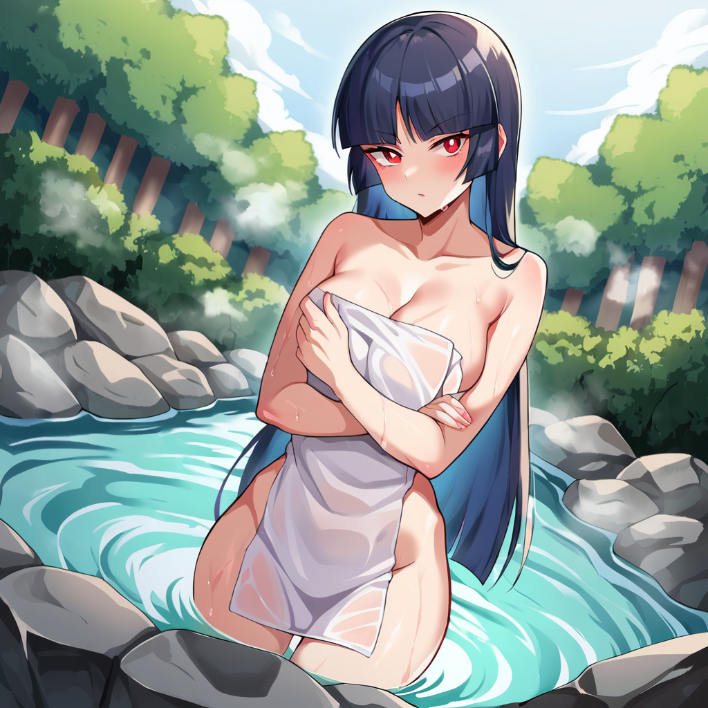 score_9, score_8_up, score_7_up, source_anime, pokemonsabrina, pokemonsabrina, black hair, long hair, bangs, blunt bangs, red eyes, hime cut, sidelocks, white pupils, nude, naked, outdoors, onsen, towel, naked towel, steam, bathing, nude cover, partially submerged, water, bath, steam censor, wet towel, looking at viewer, cowboy shot, dutch angle,