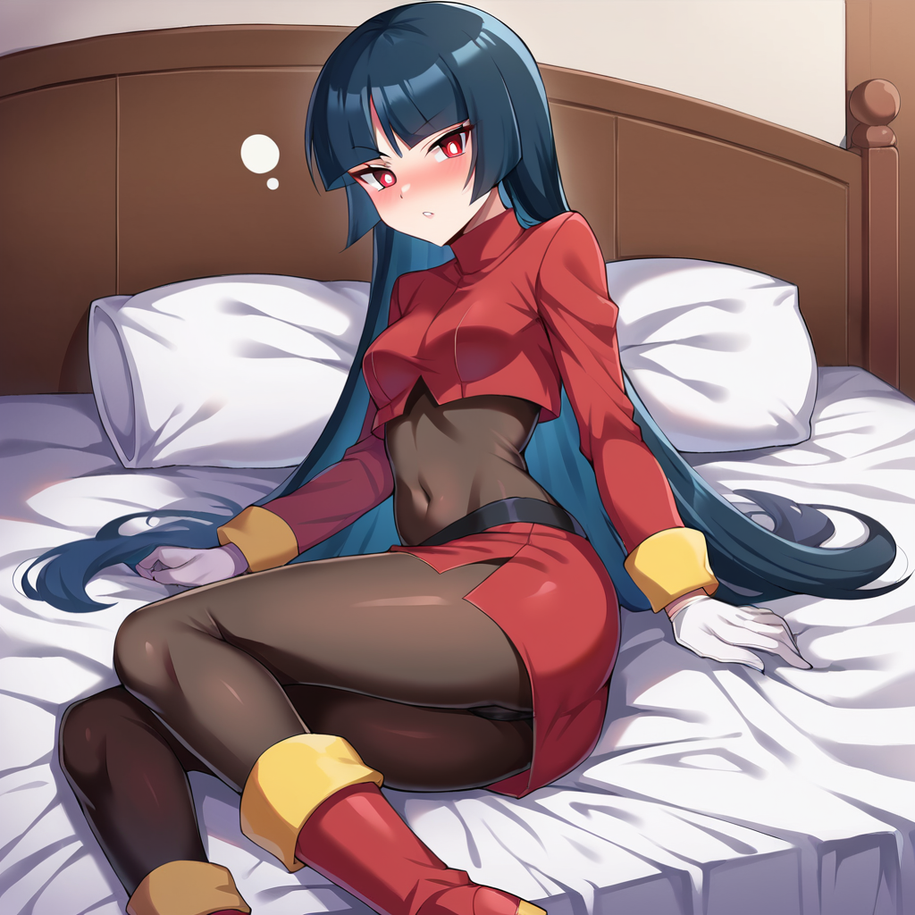 score_9, score_8_up, score_7_up, source_anime, pokemonsabrina, pokemonsabrina, black hair, long hair, bangs, blunt bangs, red eyes, hime cut, sidelocks, white pupils, jacket, crop top, bodysuit, covered navel, midriff, red jacket, turtleneck, side slit, gloves, white gloves, long sleeves, pantyhose, skirt, red skirt, boots, red boots, socks, yellow socks, knee socks, indoors, bed, bed room, on side, blush, drunk, looking at viewer, cowboy shot, dutch angle,