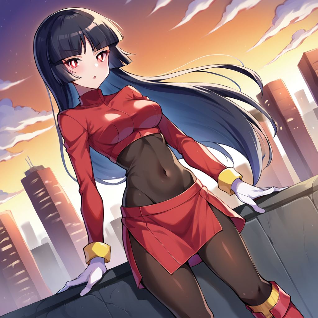 score_9, score_8_up, score_7_up, source_anime, pokemonsabrina, pokemonsabrina, black hair, long hair, bangs, blunt bangs, red eyes, hime cut, sidelocks, white pupils, jacket, crop top, bodysuit, covered navel, midriff, red jacket, turtleneck, side slit, gloves, white gloves, long sleeves, pantyhose, skirt, red skirt, boots, red boots, socks, yellow socks, knee socks, outdoors, cityscape,